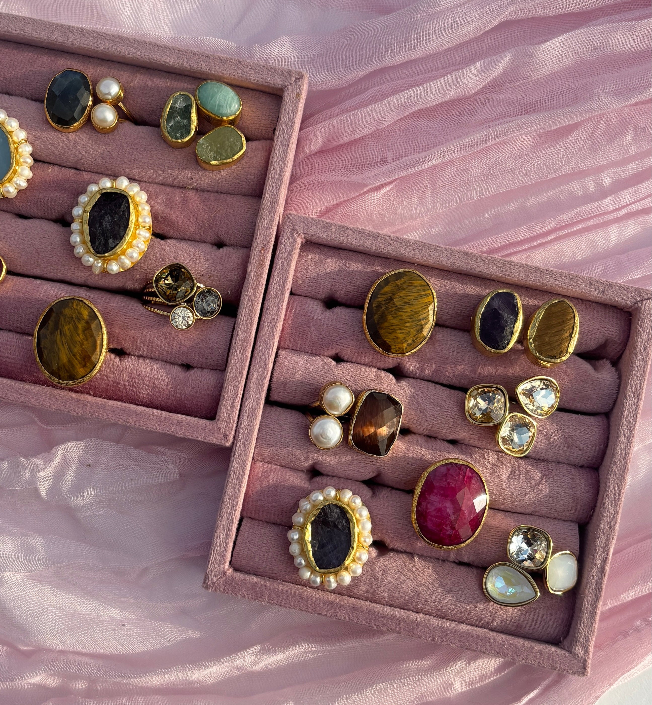 Hoe gaaf zijn deze ringen! Ze zijn van brons en natuursteen gemaakt. De ring is met een hele fijne sluiting aan de achterkant te verstellen naar je eigen maat, zonder dat hij open is. De ringen verkleuren niet, maar kunnen wel afgeven. Let hierdoor op bij het handen wassen! Het gaat hierbij om de roze ring met parels.