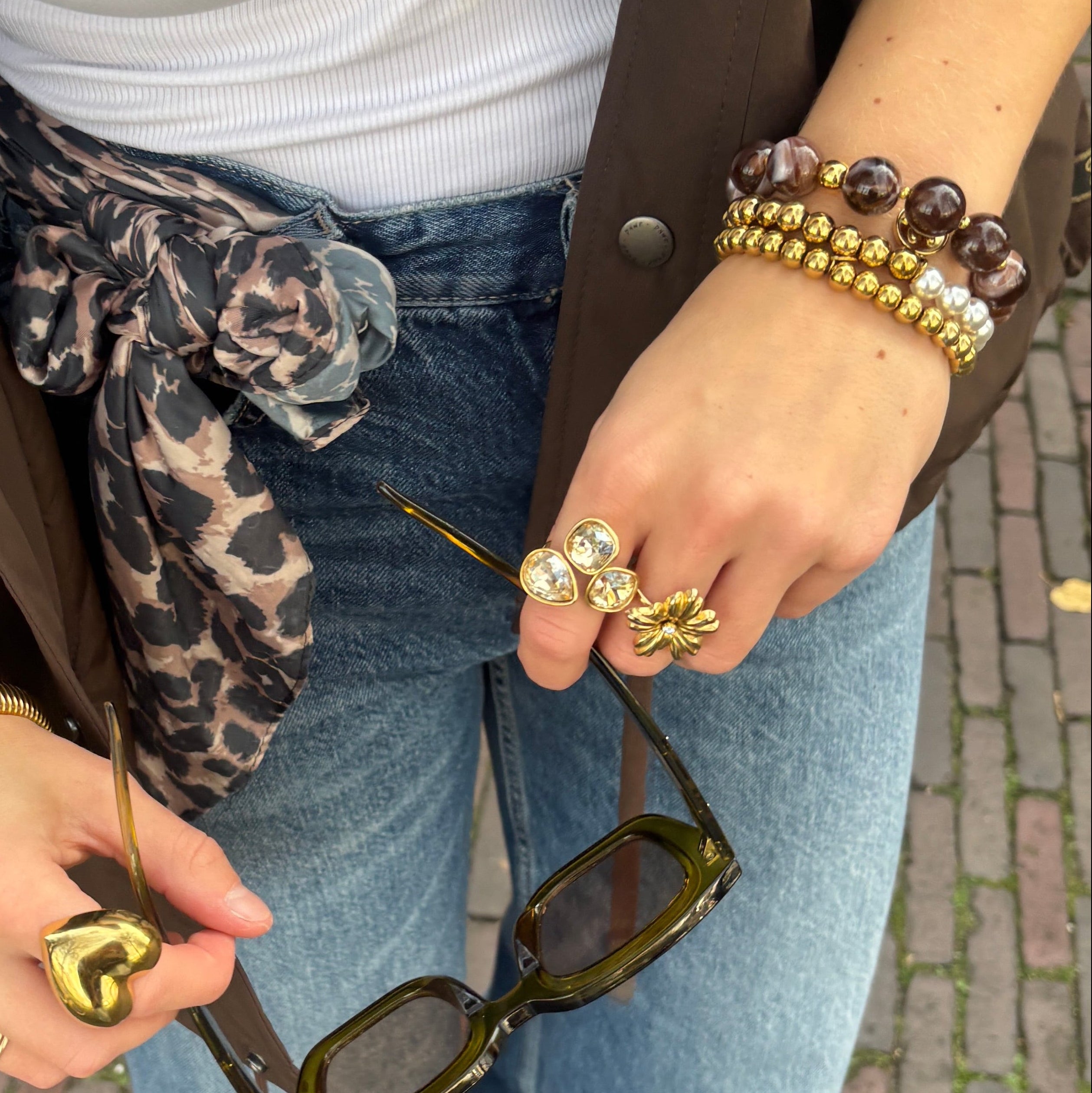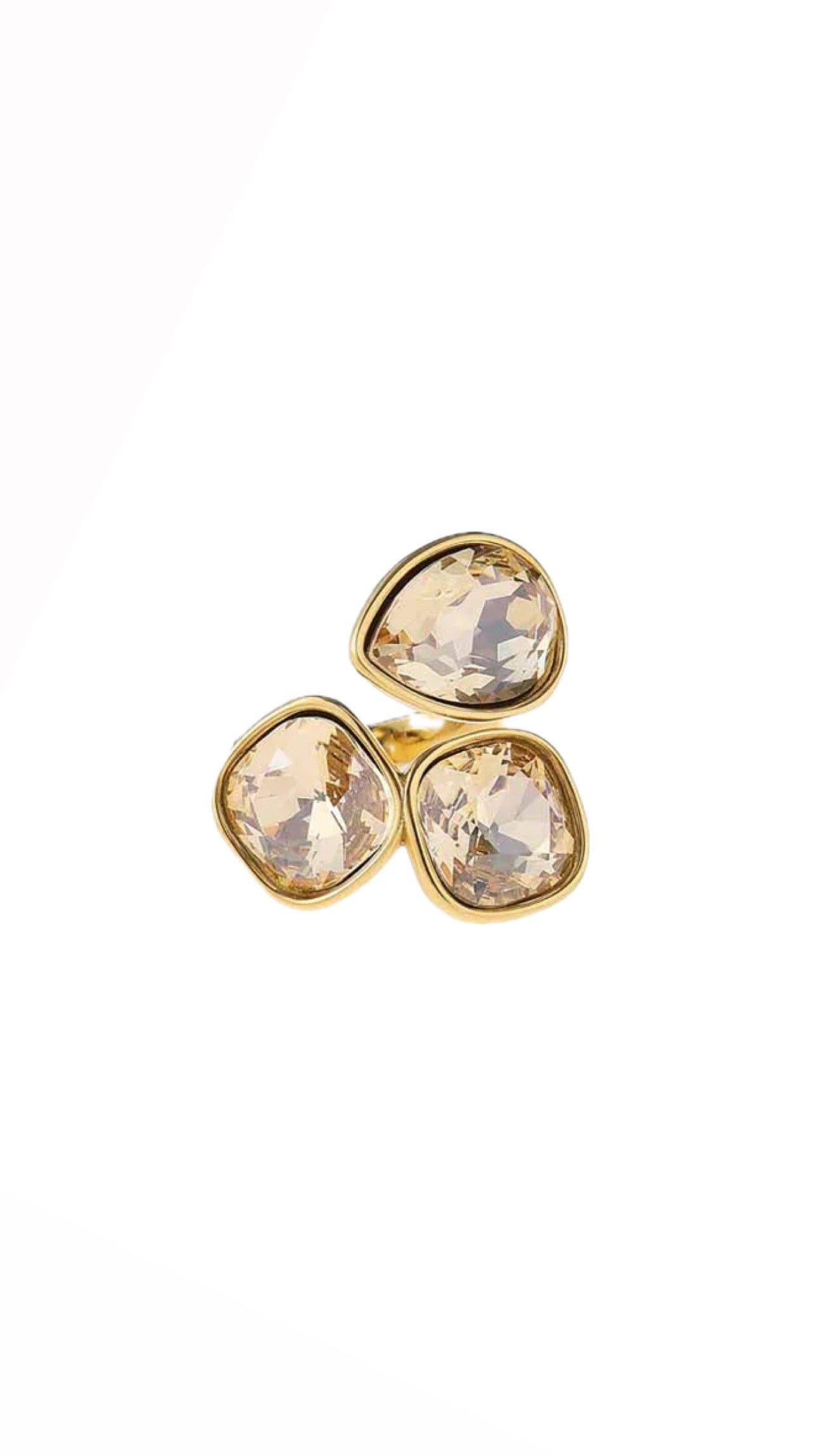 Deze prachtige ring is een uniek en elegant statement-item. Hij is voorzien van drie briljante kristallen in verschillende vormen — een vierkant, een peer en een kussen — allemaal prachtig gezet in een goudvergulde band. De rangschikking van de stenen creëert een modern, asymmetrisch design dat zowel opvallend als verfijnd is.