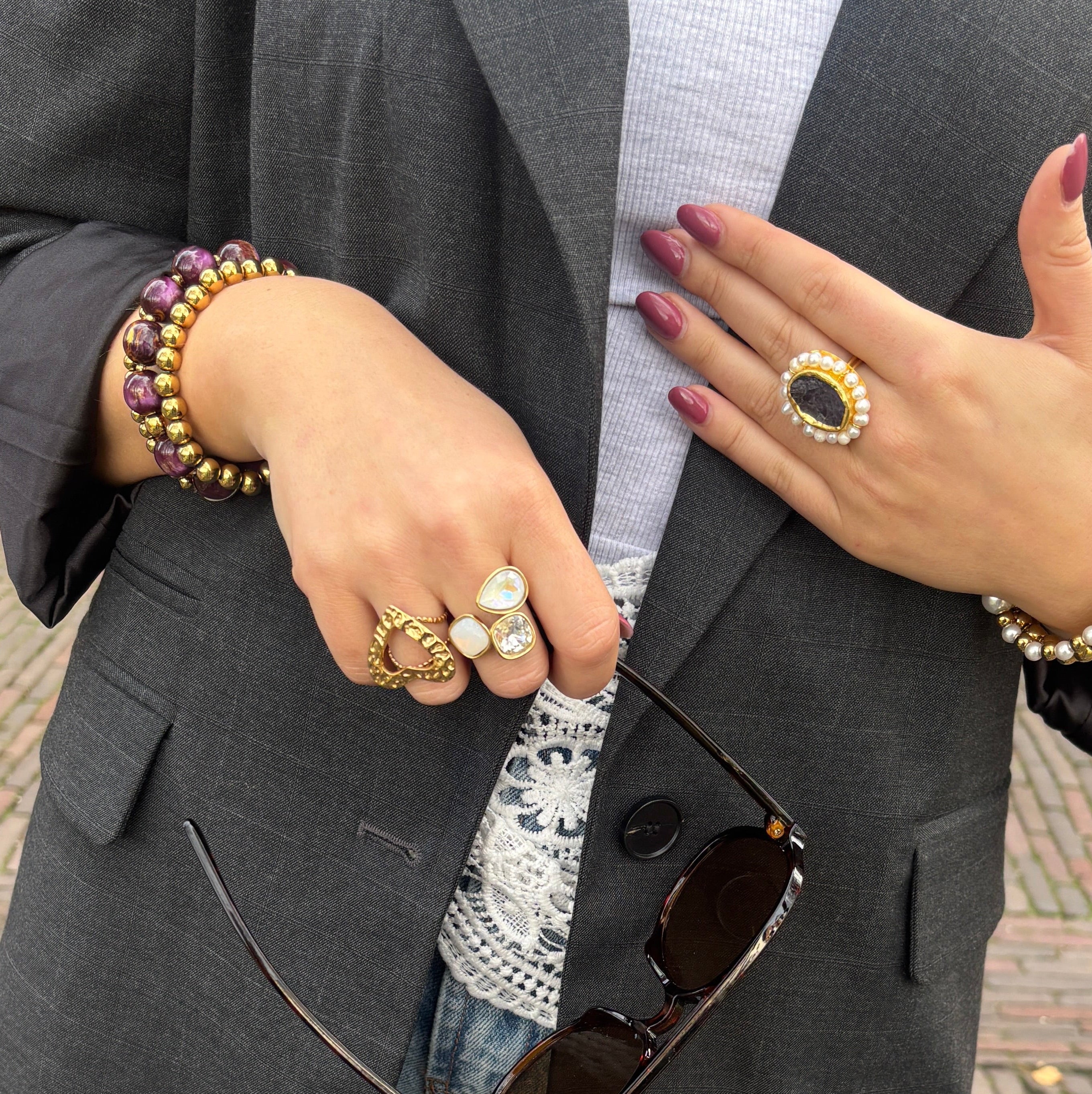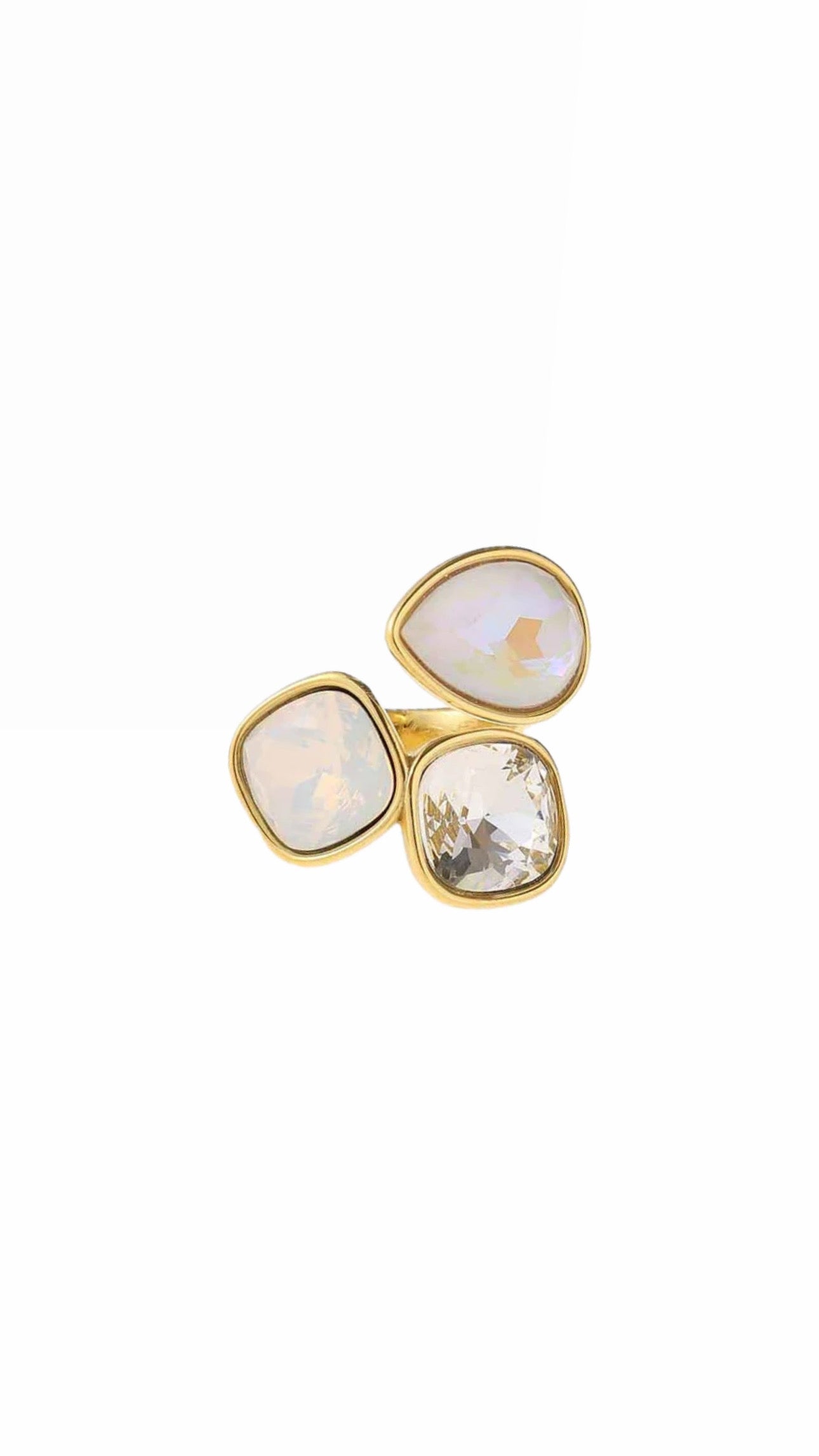 Deze prachtige ring is een uniek en elegant statement-item. Hij is voorzien van drie briljante kristallen in verschillende vormen — een vierkant, een peer en een kussen — allemaal prachtig gezet in een goudvergulde band. De rangschikking van de stenen creëert een modern, asymmetrisch design dat zowel opvallend als verfijnd is.